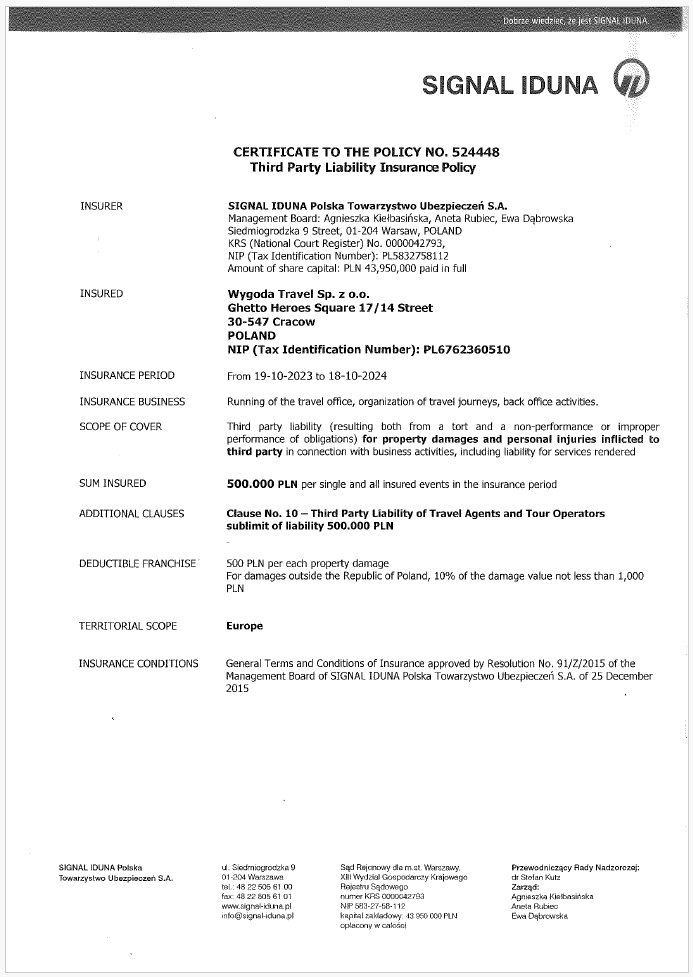 WYGODA is a fully licensed inbound & outbound tour operator based in Krakow, Poland. The company was established in 2001 and has enjoyed constant growth since then. In 2012 we received the Krakowski Dukat award in the category of business for our rapid development and innovation in tourism. In 2010 and 2014 we were given the Odys award for the best quality of travel service offered in the Malopolska region. We are also a recommended member of the Krakow Chamber of Tourism.