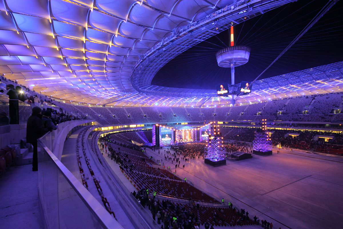 El Estadio Nacional en Varsovia fue construido para el Campeonato de Europa de Fútbol UEFA EURO 2012™. Está situado cerca del Casco Antiguo y el centro de la ciudad. Es bien visible desde muchos lugares en Varsovia, siendo especialmente atractivo desde el lado de la plaza Zamkowy. La elevación de blanco y rojo del estadio se refiere a los colores nacionales de Polonia. Una de las ventajas del estadio es su techo retráctil. Se abre en 15 minutos aproximadamente, lo que en sí mismo es un gran espectáculo. El estadio fue construido no sólo con los eventos deportivos en mente, sino también como un lugar para grandes espectáculos artísticos y diversos eventos masivos.